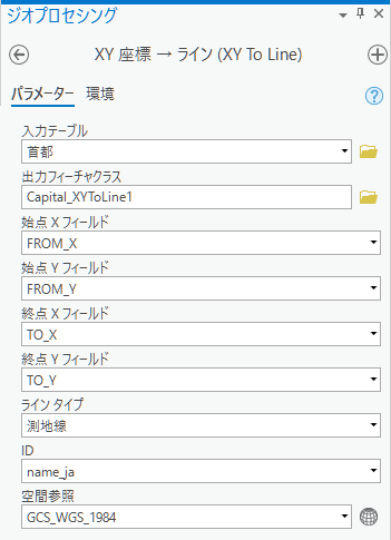 始点XY座標、終点XY座標を持ったテーブルが作成できたら [XY座標 → ライン (XY to Line)] ツールでライン フィーチャクラスを作成します。[ライン タイプ] に「測地線」を指定します。