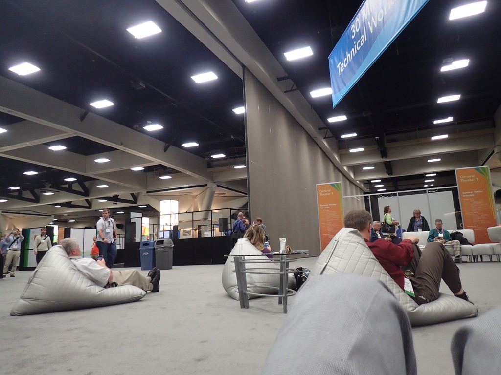 サンディエゴ国際会議場の全体と隣のホテル ヒルトンが UC の会場で、どこでも無料の Wi-Fi が利用できます。前回参加したときは限られた場所だけ利用できてたので、年々進化してます。ところどころにソファーや半寝できるクッションがあり、まったりしながらネットしたりリラックスしながら仕事ができます。