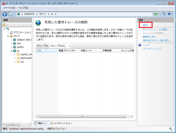 - [失敗した要求トレースの規則] で右上の [操作] ウィンドウ → [追加...] をクリック